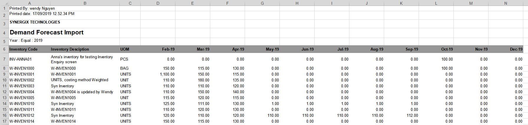 In Synergix ERP system, Demand Forecast Import Report shows inventory code with Qty for each month that was imported into the system through Inventory Demand Forecast import screen.