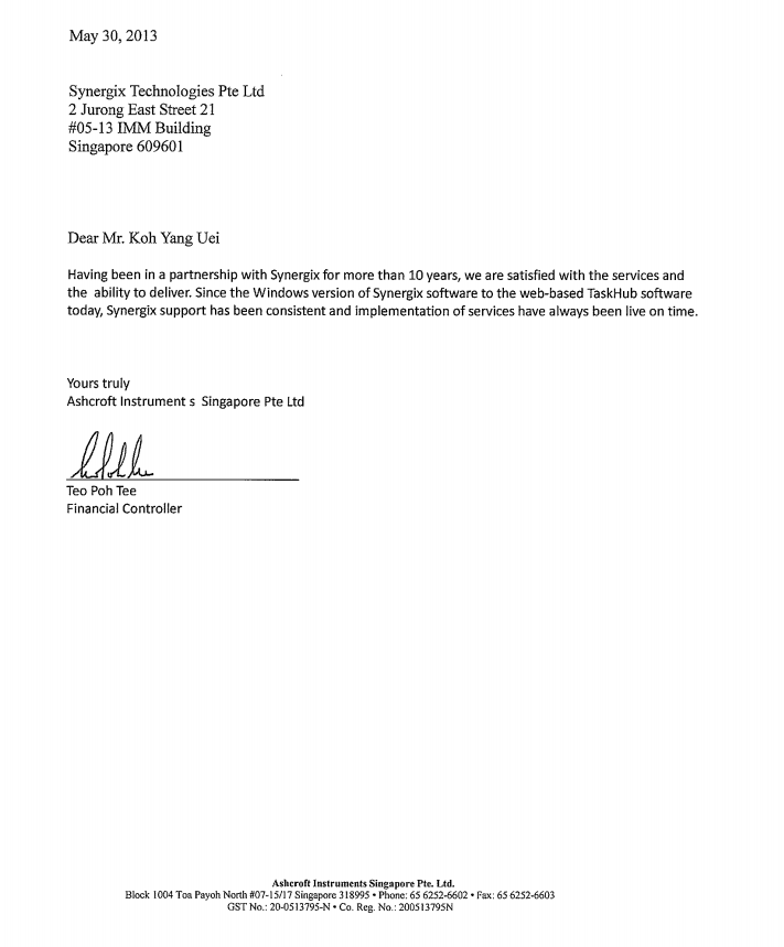 จากการเป็นพันธมิตรร่วมกับ Synergix มายาวนานกว่า 10 ปี เรามีความพึงพอใจในด้านการบริการและความสามารถในการส่งมอบงาน นับตั้งแต่ซอฟต์แวร์ Synergix เวอร์ชัน Windows มาจนถึงซอฟต์แวร์ TaskHub แบบเว็บเบสในปัจจุบัน การสนับสนุนของ Synergix นั้นมีความสม่ำเสมอเสมอมา และการติดตั้งระบบเพื่อใช้งานจริงก็เป็นไปตามกำหนดเวลาเสมอ
