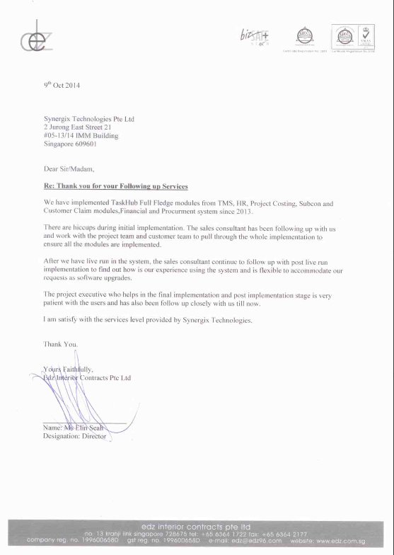 เราได้ติดตั้งโมดูล Taskhub แบบเต็มรูปแบบ ตั้งแต่ระบบบริหารจัดการเวลาทำงาน (TMS), ทรัพยากรบุคคล (HR), การคิดต้นทุนโครงการ (Project Costing), ระบบผู้รับเหมาช่วง (Subcon), ระบบเคลมลูกค้า (Customer Claim) ไปจนถึงระบบการเงินและการจัดซื้อมาตั้งแต่ปี 2013