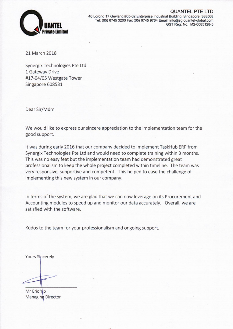 เมื่อช่วงต้นปี 2016 บริษัทของเราได้ตัดสินใจนำระบบ TaskHub ERP จาก Synergix Technologies Pte Ltd มาใช้งาน โดยเรามีเงื่อนไขว่าต้องดำเนินการฝึกอบรมให้แล้วเสร็จภายใน 3 เดือน ซึ่งถือเป็นโจทย์ที่ท้าทายอย่างยิ่ง แต่ทีมงานติดตั้งระบบก็ได้แสดงความเป็นมืออาชีพอย่างสูง จนสามารถผลักดันให้โครงการทั้งหมดเสร็จสมบูรณ์ได้ตามกำหนดการ ทีมงานมีการตอบรับที่รวดเร็ว ให้การสนับสนุนเป็นอย่างดี และมีความเชี่ยวชาญ ซึ่งช่วยลดความยุ่งยากในการนำระบบใหม่มาปรับใช้ในองค์กรของเราได้มาก