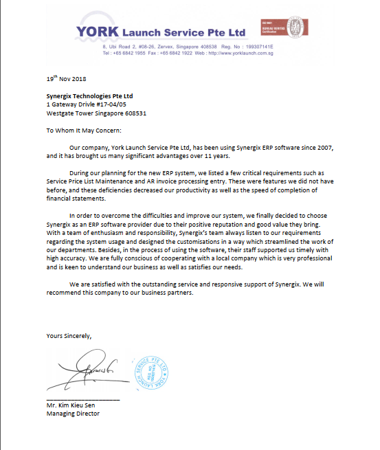 บริษัทของเรา ยอร์ค ลอนช์ เซอร์วิส พีทีอี จำกัด ได้ใช้งานซอฟต์แวร์ Synergix ERP มาตั้งแต่ปี 2007 และระบบนี้ได้สร้างข้อได้เปรียบที่สำคัญมากมายให้แก่เราตลอดระยะเวลากว่า 11 ปีที่ผ่านมา